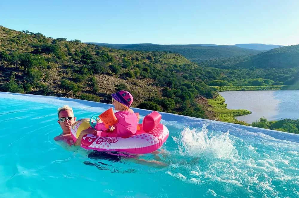 I've watched Side by Side Safaris videos on social media and YouTube several times, and it was partly what sold the trip, but when you arrive at the 6-star lodge, it's even more beautiful than in the videos. The view is breathtaking and the lodge is the best we've ever stayed in. We had barely hit our lodge before Karoline wanted to be in the pool. With that view, I wasn't hard to get onboard.